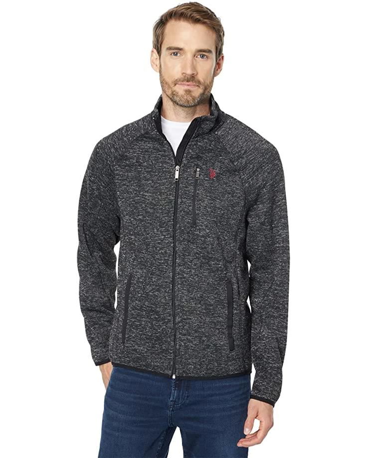 - A super comfortable style, perfect for brisk days, the U.S. POLO ASSN.® Space Dye Zip Front Sweater Fleece features a stand collar a zippered chest pocket.