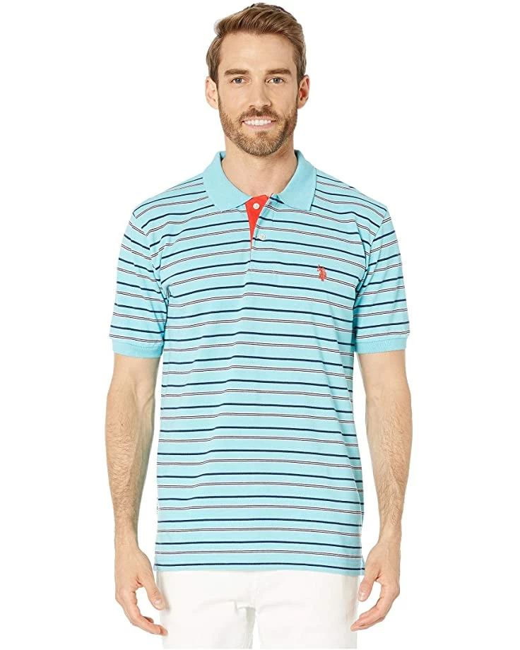 - You’ve hit the jackpot with this U.S. POLO ASSN.® Double Stripe Polo. With fun, colorful stripes, this short sleeve top really makes your outfit pop. Classic contrast collar with double-button placket also adds to the appeal.