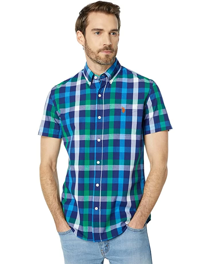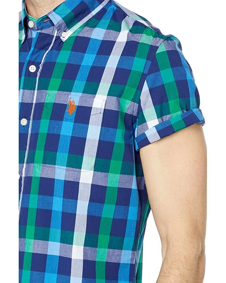 - Add a pop of color to your attire with the bright and stunning U.S. POLO ASSN.® Short Sleeve Classic Fit Yarn-Dye Heathered Plaid Woven Shirt.