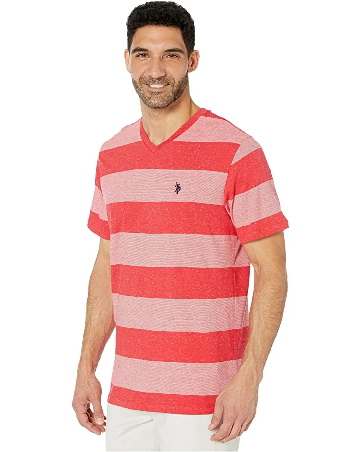 - Classic and cool, the wide stripes of this U.S. POLO ASSN.® Short Sleeve Stripe V-Neck Tee are just what you need to step into the weekend. Boasting a sexy V-neck and straight hem, you leave much to be desired in this top.