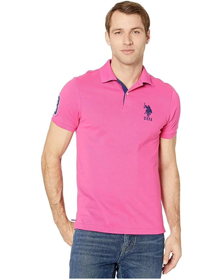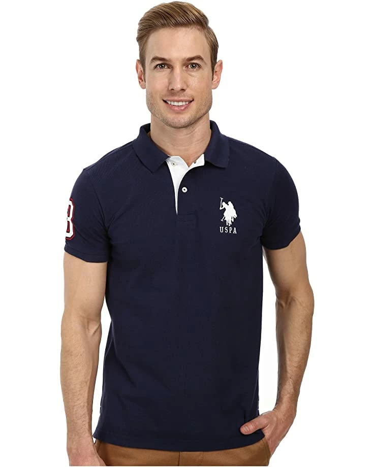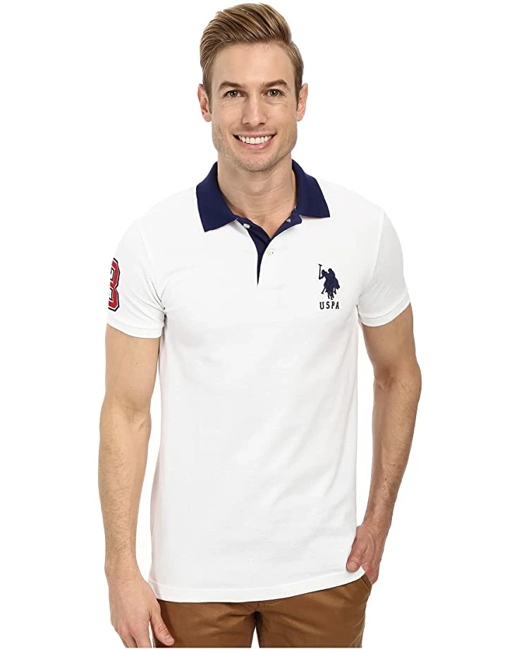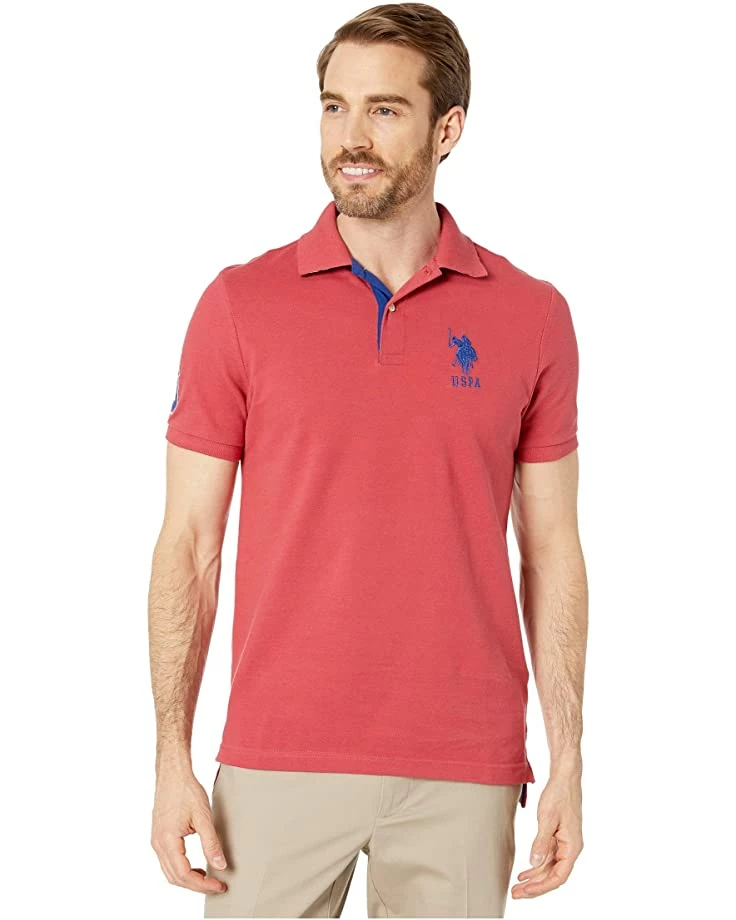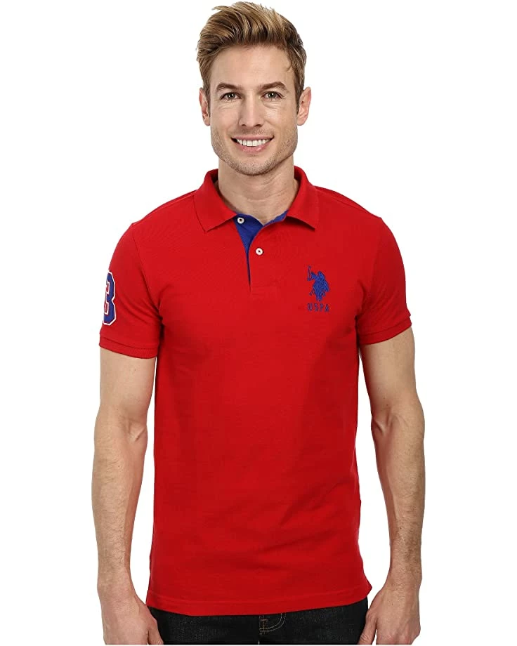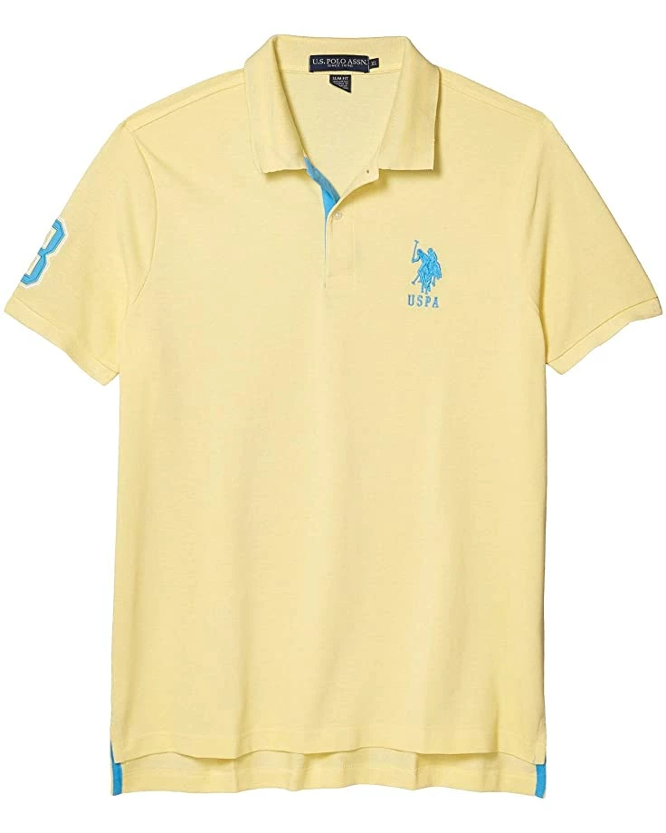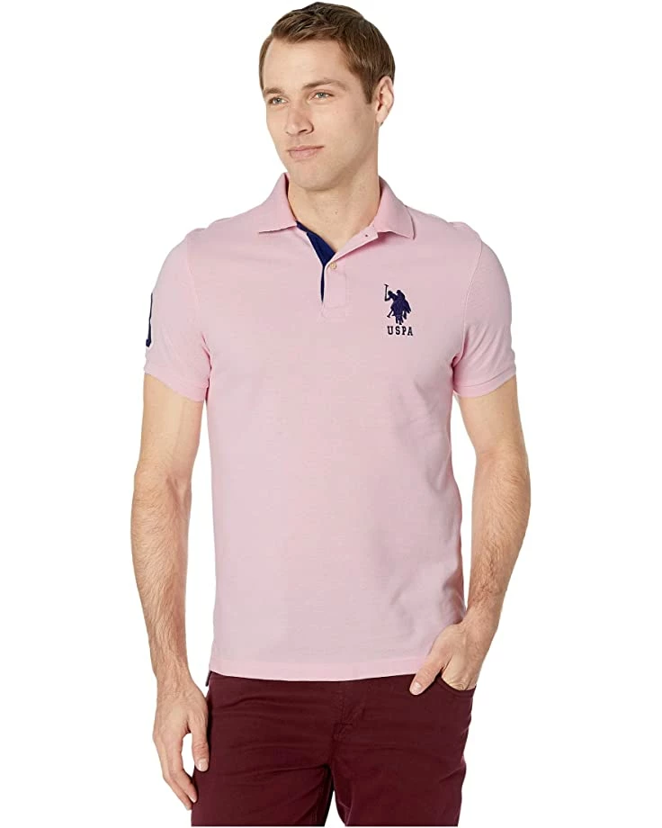 - Exemplify classic-cool style in the laid-back U.S. POLO ASSN.® Slim Fit Big Horse Polo w/ Stripe Collar. The short-sleeve design boasts slim-fit silhouette in a solid colorway with contrasting pops of color.
